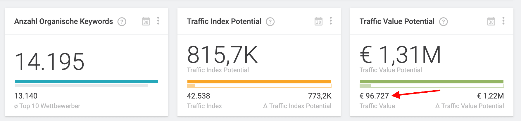 Daraus folgt der Traffic Value (Wert der SEO), den man sich mit den vorhandenen Rankings an Google Ads Werbung spart. Im Beispiel spart sich sich die Webseite monatlich knapp 100.000 Euro an Ads Kosten. Der Wert liegt also etwas unter 1,2 Mio. Euro pro Jahr.